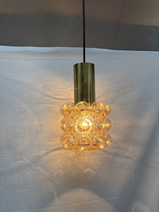 Illuminez votre espace avec la magnifique suspension Helena Tynell, un chef-d'œuvre de Glashütte Limburg. Cette pièce exceptionnelle se distingue par son captivant design en verre bullé qui diffuse la lumière avec élégance, créant une ambiance chaleureuse et accueillante. La structure en laiton raffinée apporte une touche de sophistication et s'intègre parfaitement à tout intérieur de style moderne du milieu du siècle.