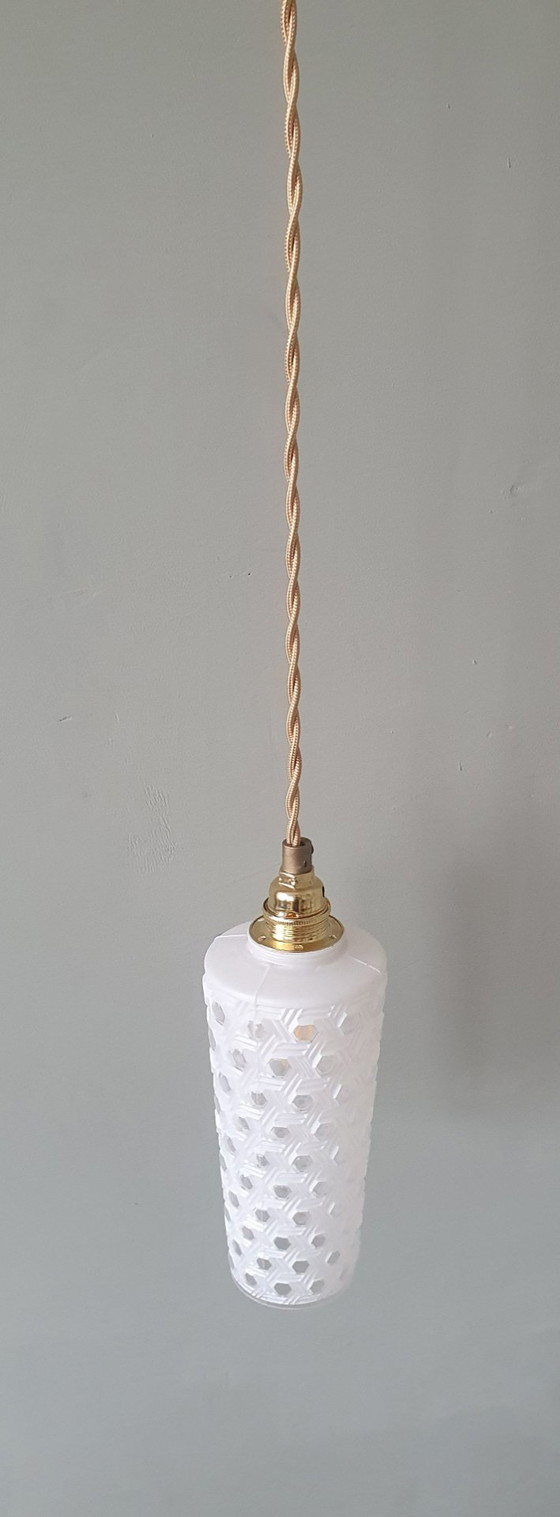 Suspension vintage milieu du siècle, forme conique, verre pressé dépoli à motifs.