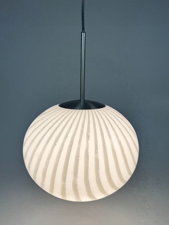 Magnifique suspension vintage de la célèbre marque allemande Peill & Putzler, datant des années 1980. Son abat-jour ovale en verre opale soufflé à la bouche arbore le motif tourbillonnant caractéristique qui fait le succès de ces modèles. Allumée, la suspension diffuse une lumière chaude et homogène qui crée instantanément une ambiance chaleureuse dans n'importe quelle pièce. Ce modèle est doté d'une structure, d'une tige et d'une rosace en acier inoxydable. Il est également fourni avec un long câble de suspension. En très bon état, sans traces d'usure notables.