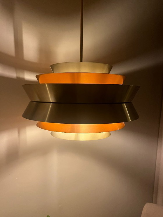 Une superbe suspension Trava dorée. Cette lampe, assez rare, témoigne du talent des Suédois pour le design. Créée par Carl Thore pour Granhaga Metallindustri à la fin des années 60.