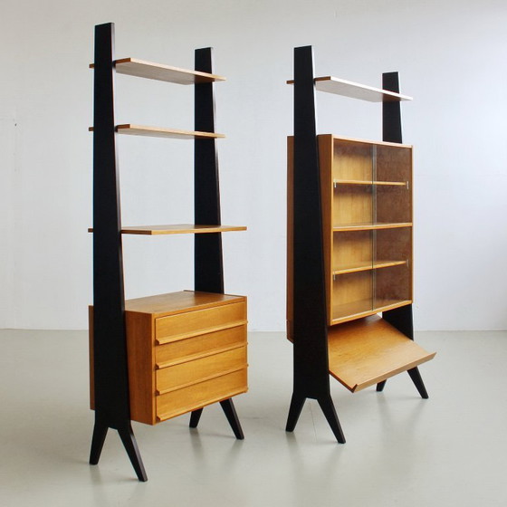 Plongez dans l'élégance des années 60 avec ce superbe système d'étagères modulaires vintage. Entièrement restauré, ce meuble mural du milieu du siècle témoigne d'un design intemporel et d'une fonctionnalité remarquable. Ses lignes épurées et ses tons chauds de bois sont sublimés par d'élégants accents noirs, en faisant la pièce maîtresse idéale pour tout intérieur raffiné.