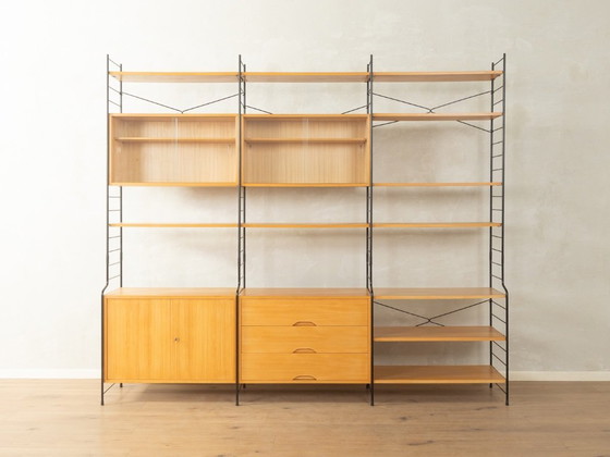 Système mural modulable et généreux du fabricant WHB, alliant une esthétique raffinée à une grande polyvalence fonctionnelle. Design emblématique des années 1960, ce meuble incarne l'essence même du style Mid-Century. L'association d'échelles en métal noir et d'éléments en placage de frêne clair confère à l'étagère une légèreté aérienne. Deux éléments d'exposition, un module à trois tiroirs spacieux et un autre élément à portes en bois offrent un espace de rangement pratique. Une pièce intemporelle soigneusement restaurée et présentée en bon état vintage.