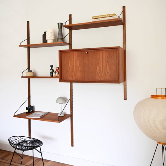 Magnifique système mural en teck, conçu par Poul Cadovius. Ce système modulaire, entièrement personnalisable, se compose d'un meuble bas, de trois étagères et d'une tablette de bureau.