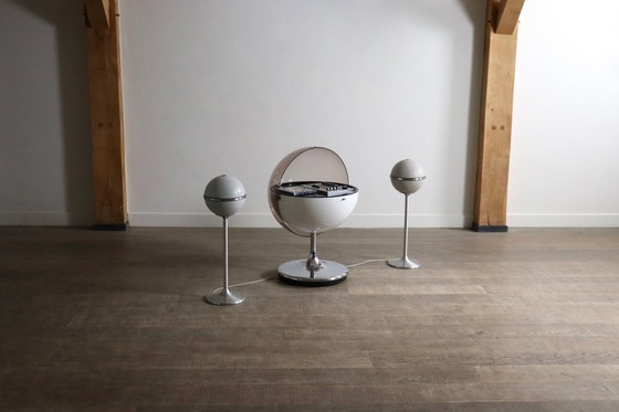 Ce système audio sphérique repose sur un socle tulipe chromé et est associé à deux enceintes sphériques Grundig Audiorama 7000, achetées avec le système en 1971.