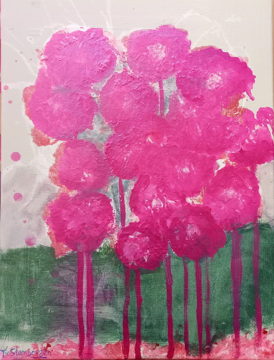 Découvrez l'univers vibrant de Tineke van Steenbergen avec cette magnifique peinture acrylique, « Reste avec moi ». Cette œuvre unique, aux teintes roses audacieuses et aux subtiles touches de vert, apporte une note de fraîcheur et de modernité à votre intérieur.