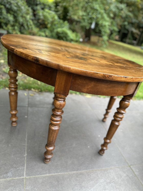 Cette table anglaise ancienne respire le charme et l'artisanat. Elle est fabriquée en bois massif, probablement en noyer ou en orme teinté, et présente une patine riche et chaude qui s'est encore embellie au fil des ans. La table est de forme ronde avec un plateau rabattable (drop-leaf), ce qui lui permet de servir de table murale ou de console.