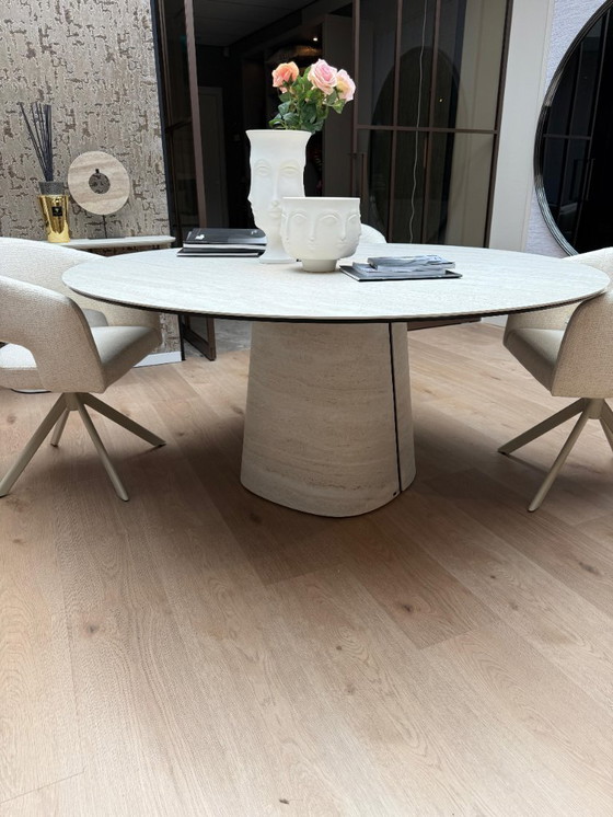 Nouvelle collection ! Exposée dans notre showroom depuis seulement deux mois. En raison d'un déménagement en 2026, nous liquidons l'intégralité de notre stock. Cette magnifique table, entièrement en céramique, ne fait pas exception. Son piètement est tout simplement sublime. Unique ! Céramique incurvée. Cette table de salle à manger est un véritable bijou. Entièrement réalisée en céramique Marmi KM21 Colosseo (travertin). Dimensions : ø140 x 75 cm.