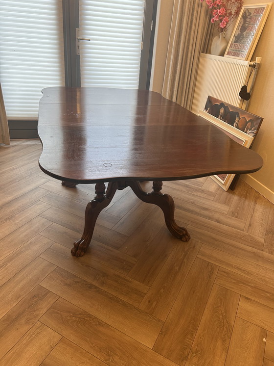 Magnifique table à manger ancienne en bois massif avec pieds griffes classiques.