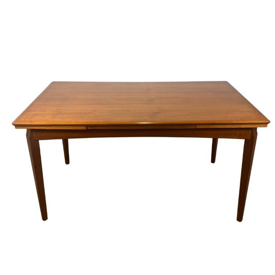 Plateau rectangulaire en bois (probablement placage teck sur bois massif), avec bords arrondis reposant sur un piétement effilé. La table dispose de deux rallonges intégrées, rangées sous le plateau, permettant de passer d’un format compact à une grande table conviviale.