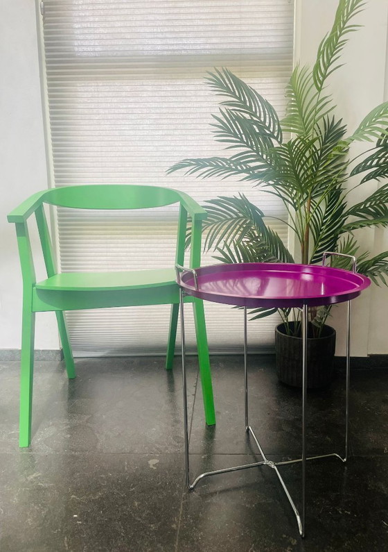 Table d'appoint super pratique et accrocheuse de la marque allemande Haku Möbel. Plateau amovible en violet vif sur une base chromée pliante. Idéale comme table d'appoint, chariot de service ou accent décoratif. En bon état !