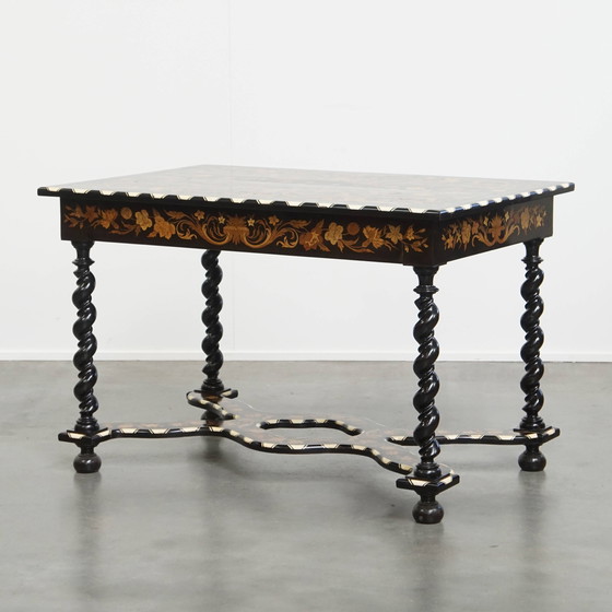 Un objet original et d'une beauté unique pour l'amateur ! Cette table hollandaise ancienne attire l'attention par son aspect gracieux, en partie dû à ses pieds tournés et à sa belle marqueterie. Ces incrustations se composent d'os et de plusieurs types de bois dans des motifs étonnants. Une telle table est un véritable chef-d'œuvre qui ne fait aucun compromis sur le luxe et l'apparence. Qu'elle soit placée dans un intérieur classique ou moderne, elle s'impose toujours et ajoute de l'élégance à l'espace choisi. Après des années d'utilisation responsable, comme vous pouvez le voir sur les photos, il a subi quelques signes d'utilisation normaux/ minimes. Structurellement, il est en bon état et immédiatement utilisable et avec une utilisation et un entretien appropriés, il durera des années à venir ! Où allez-vous placer ce superbe accroche-regard ?