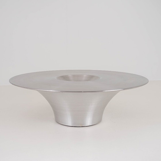 Cette pièce sculpturale présente une silhouette spectaculaire évoquant un OVNI. Réalisée en aluminium filé avec un plateau en acier inoxydable brossé, sa forme fluide et futuriste en fait une pièce maîtresse dans tout intérieur moderne.