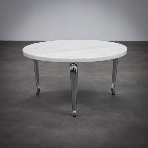 Le plateau circulaire en marbre offre une surface apaisante et intemporelle, dont les veines naturelles apportent une variation discrète et une profondeur subtile. En dessous, trois pieds chromés allongés s'étendent vers l'extérieur dans un geste sculptural, évoquant les proportions élancées d'un teckel, qui a inspiré le nom Bassotti. Le métal poli reflète la lumière et l'environnement, créant un dialogue dynamique entre la surface en pierre massive et le piètement réfléchissant.