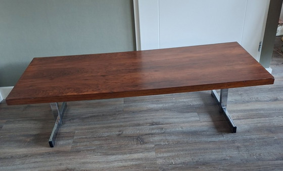 Cette magnifique et rare table basse de Meubelindustrie Gelderland N.V. (Culemborg), fabriquée en 1967, est un parfait exemple du design moderne du milieu du XXe siècle. Design néerlandais. Son plateau en palissandre massif dégage chaleur et élégance et s'harmonise parfaitement avec ses pieds en métal aux lignes épurées, qui lui confèrent stabilité et modernité.