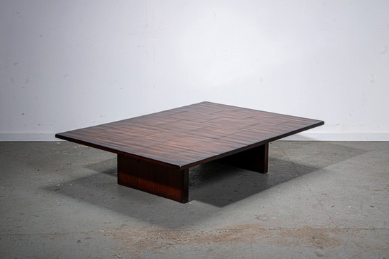 Table basse Axel Vervoordt, Belgique 1980. Forme basse et épurée repose sur deux supports massifs, Plateau en bambou teinté foncé présente de subtiles variations de ton et un veinage. Dimensions: Hauteur: 36 cm. Largeur: 150 cm. Profondeur: 110 cm.
