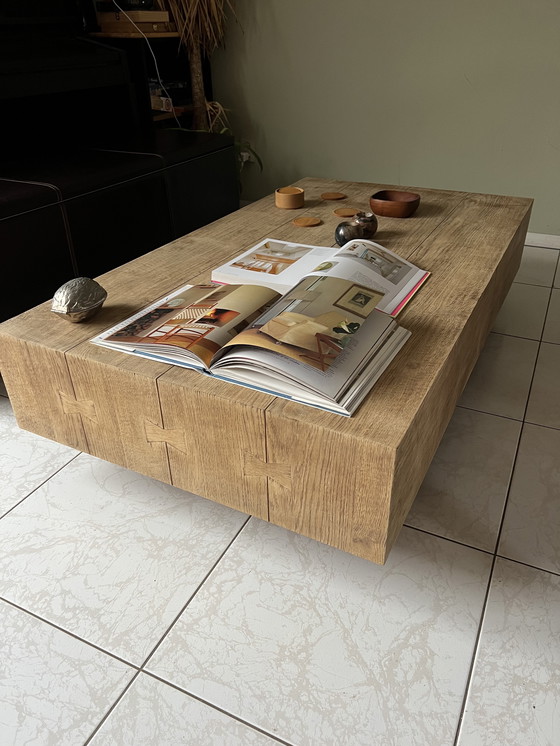 Une magnifique table basse en placage de bois. Ce bloc rectangulaire de 100 x 140 cm, reposant sur un piètement en bois, semble flotter dans le sol. Ses dimensions offrent un espace généreux pour mettre en valeur de beaux objets, ce qui en fait un véritable atout charme. La chaleur du bois lui confère un style champêtre minimaliste.