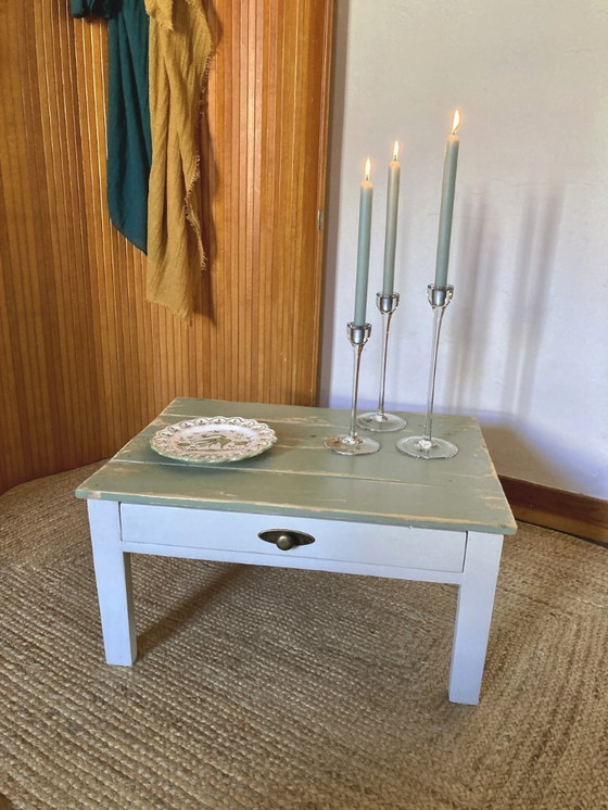 Petite table basse en pin massif, type table de ferme, avec grand tiroir.