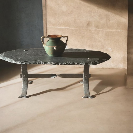Cette table basse exceptionnelle se compose d'un piètement en fonte finement travaillé et d'un plateau en pierre de forme irrégulière, au charme authentique et à la patine remarquable. Elle est en parfait état vintage.