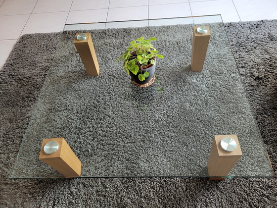 Une élégante table basse en verre au design moderne. Son plateau transparent repose solidement sur quatre pieds en bois, créant un style minimaliste et raffiné. Idéale pour un salon alliant style et fonctionnalité.
