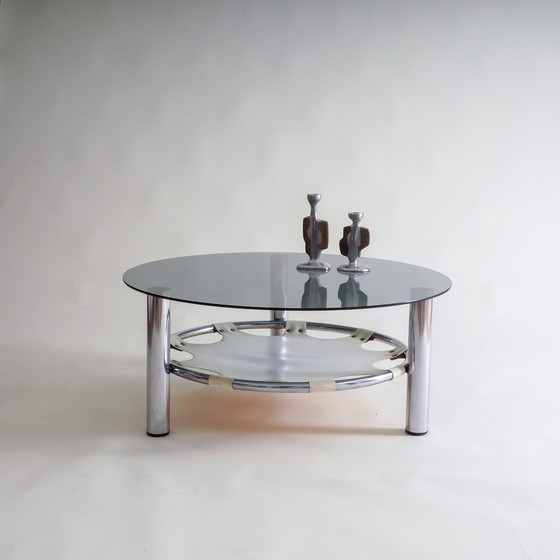 Cette étonnante table basse de l'ère spatiale est composée d'une structure chromée élégante, d'un plateau en verre magnifiquement poli et d'un élégant porte-revues en skaï. La table est en bon état, surtout si l'on tient compte de son âge, ce qui en fait un complément idéal pour les intérieurs modernes et rétro.