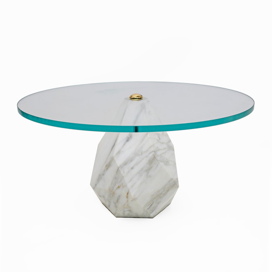 Table basse moderne et minimaliste avec un épais plateau circulaire en verre transparent. La base centrale de la table est en marbre de Carrare blanc veiné de gris, avec un design géométrique et facetté qui ajoute de l'intérêt visuel et de l'élégance. Une plaque vissée au centre du plateau en verre sert d'élément de liaison entre le plateau et la base en marbre, ce qui lui confère un aspect luxueux. Dans l'ensemble, le design est élégant et raffiné, et convient aussi bien aux intérieurs contemporains que non contemporains. Une paire est disponible, au prix unitaire.