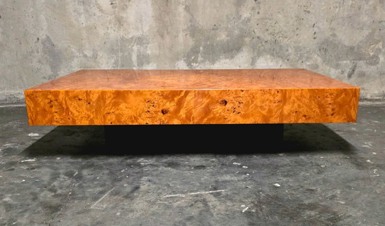 Table basse Jean-Claude Mahey pour Roche Bobois, placage de loupe d’orme, années 70