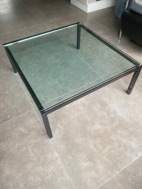 Un classique du design : la table basse Metaform M-1, une création néerlandaise de Hank Kwint, associe une structure en acier inoxydable noir à un plateau en verre transparent de 18 mm d’épaisseur.