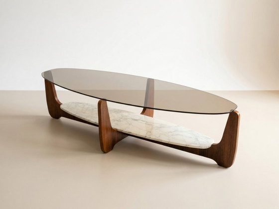 Table en 3 éléments : structure en placage de bois de rose, plateau en marbre blanc et plateau en verre fumé.