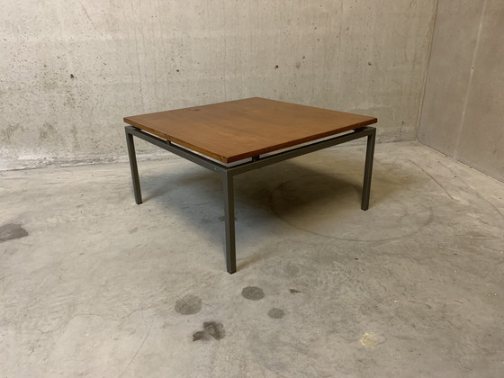 Magnifique petite table basse, structure en métal avec plateau en teck en porte-à-faux.