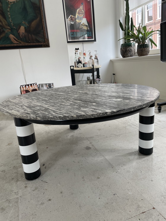 Cette table basse postmoderne présente un design saisissant avec un plateau en marbre et des pieds à rayures noires et blanches. Son esthétique unique en fait une pièce à part dans tout espace de vie. La table est fabriquée à partir de matériaux de haute qualité, garantissant durabilité et style. Elle est parfaite pour ceux qui souhaitent ajouter une touche postmoderne à leur décoration intérieure.