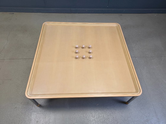 Table basse rare avec pieds chromés, plateau en bois et verre avec bouchons de liège.