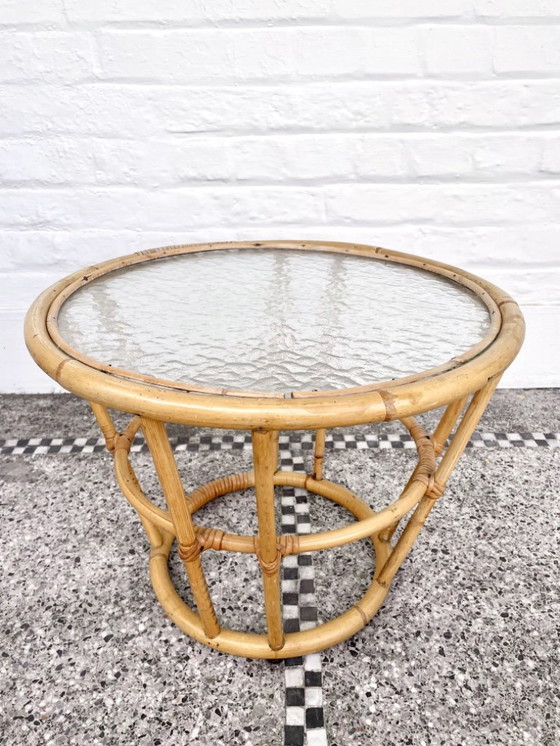 Jolie petite table d'appoint Rohe Noordwolde en rotin et verre ancien d'origine. Années 1950-1960. Très bon état vintage. Diamètre plateau verre 50 cm. Hauteur 37 cm. Diamètre pied 32 cm. Livraison possible Paris.