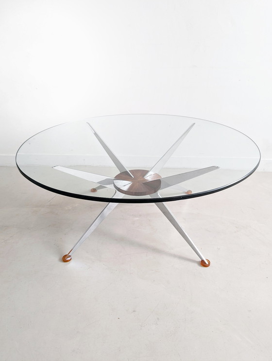 Table basse en forme d'étoile de l'ère spatiale par le fabricant allemand COR, années 1960. La table basse est composée d'une base en teck et en chrome et d'un plateau en verre rond et transparent.