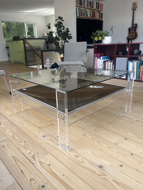Table basse unique en verre avec base en plexiglas et compartiment en verre fumé.