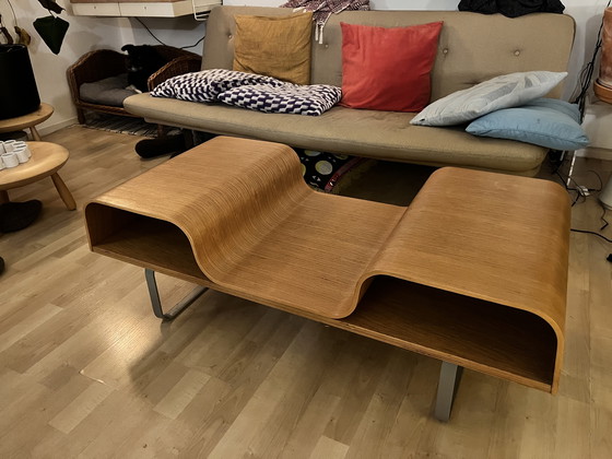 Remontez le temps avec cette table basse IKEA Lagfors en contreplaqué vintage, une véritable pièce maîtresse pour votre salon. Son design unique, évoquant des vagues, attire le regard et offre des solutions de rangement pratiques grâce à ses compartiments ouverts.