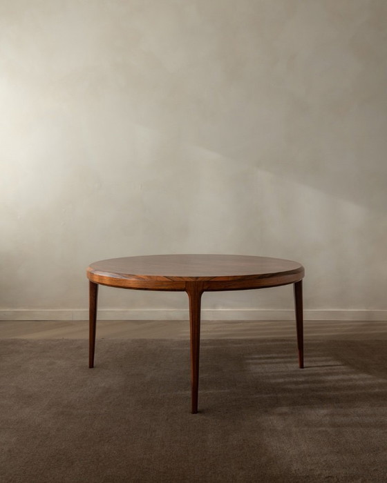 Une table basse ronde en palissandre d'une élégance sobre (Ø 100 cm), conçue par Johannes Andersen et produite par CFC à Silkeborg (Danemark). Cette pièce incarne à la perfection la chaleur du design danois moderne et le minimalisme architectural.