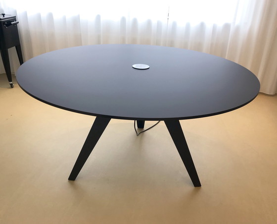 Table ronde Belly by Odesi diamètre 150cm. Design Kees Marcelis. Le dessous du plateau de la table est composé de couches étagées de MDF peintes au pistolet en RAL 8022. La couche supérieure de la table est en Fenix NTM couleur Nero. Fenix NTM fait appel à la nanotechnologie et possède une couche supérieure durcie. La surface est douce au toucher et ne laisse pas de traces de doigts. Cette couche supérieure est antistatique et les micro-rayures peuvent être facilement éliminées par la chaleur. La base repose sur trois pieds en métal de couleur noire RAL8022. Au milieu du plateau se trouve une unité intégrée avec 2 prises de courant.