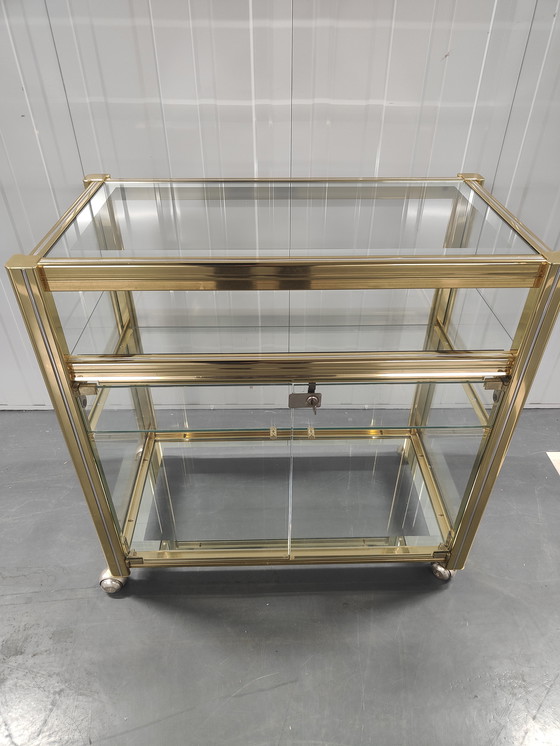 Table de bar française. Cette table à roulettes dorée et chromée a été fabriquée à Paris dans les années 1960 par Pierre Vandel. Sur 4 roues solides, très maniable. Chariot de bar fabriqué par le prestigieux Pierre Vandel à Paris entre 1960-1969. Ce chariot roulant a 4 étages. Il est très solidement construit. A l'avant se trouvent 2 portes en verre avec serrure et clé. Les étagères en verre transparent sont recouvertes d'une couche de miroir sur les bords. L'or est mélangé au chrome. Il roule comme une Rolls.