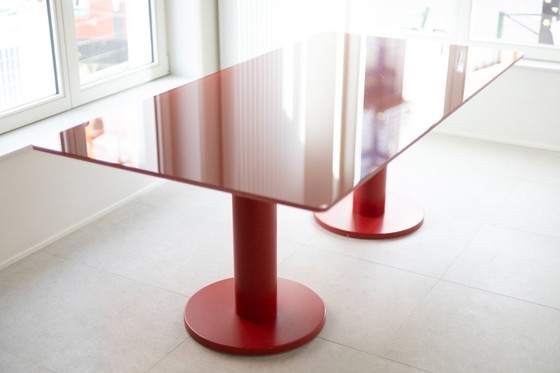 Table Edra rouge monochrome unique de la série Croma, dessinée par Massimo Morozzi. Modèle très exclusif de 2005. Hors production et quasiment introuvable. Modèle original. Plateau en verre trempé laqué (15 mm) et pieds en métal laqué. Quelques légers dommages et traces d'usure.