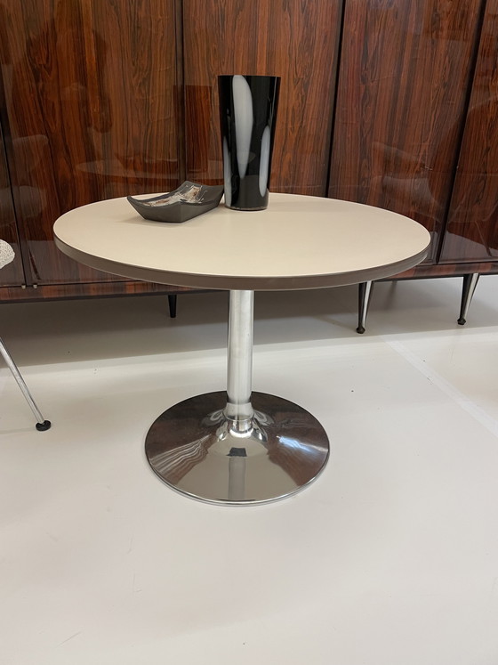 Pied trompette chromé, plateau en Formica crème mat, bordé d'un liseré brun caramel.
