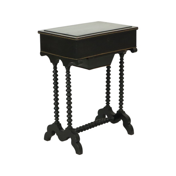 Magnifique table de couture ou table d'appoint en acajou laqué noir, avec pieds tournés en forme de canette, fin du XIXe siècle, France.