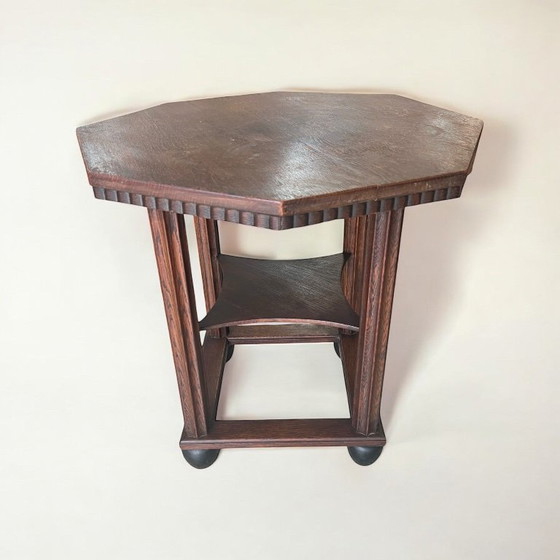 La table est en très bon état vintage et présente de légères traces d'usure dues à l'âge, qui soulignent le charme et l'histoire du meuble. Qu'elle soit utilisée comme table d'appoint pratique dans le salon, comme pièce de décoration élégante ou comme point fort dans un intérieur vintage, cette table Art déco allie fonctionnalité et élégance intemporelle. Une pièce magnifique qui apporte histoire et style à votre intérieur !