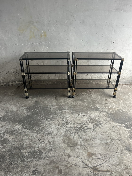 Une pièce vintage frappante des années 1980. Cette table d'appoint/chariot de bar polyvalent présente des étagères en verre fumé combinées à un cadre tubulaire dans une finition aux tons clairs. Les lignes épurées et les détails subtils lui confèrent un look rétro intemporel, à la fois fonctionnel et décoratif.