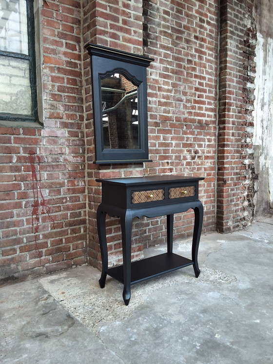 Élégante table d'appoint avec miroir assorti, idéale pour l'entrée. Fabriquée en bois, la table présente une finition noire raffinée rehaussée de détails dorés. Les tiroirs, ornés d'un motif unique, offrent un espace de rangement pratique. Le miroir, avec son cadre classique, complète harmonieusement l'ensemble. Apportez une touche d'élégance à votre intérieur avec ce charmant duo.