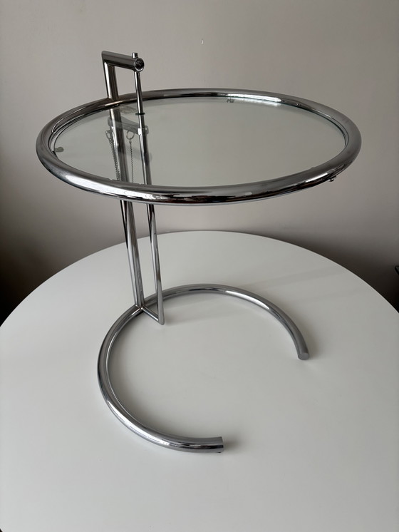 Table d'appoint Eileen Gray originale (marquée) chromée E 1027 avec plateau en verre