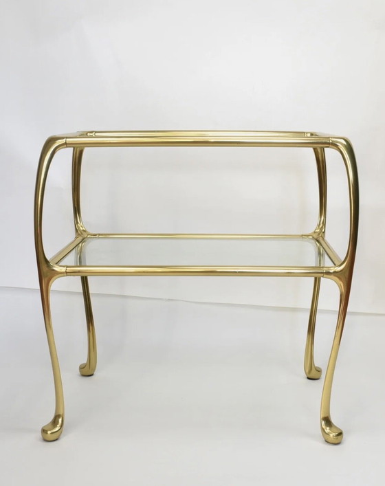 Table d'appoint italienne en laiton, à pieds galbés de style Queen Anne. Bel exemple de style Hollywood Regency. Fabricant inconnu. Époque : probablement fin des années 1950/début des années 1960. Comprend deux plateaux en verre d'origine.