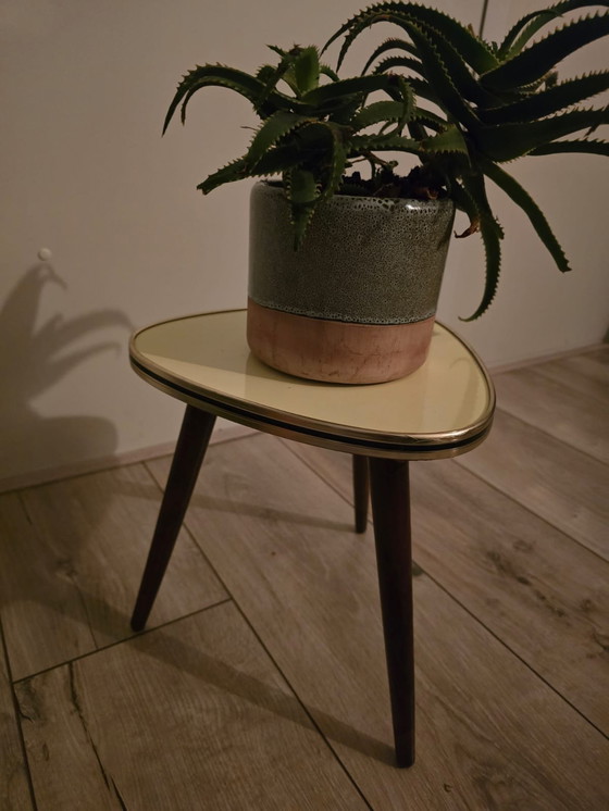 Cette charmante table d'appoint dégage un charme rétro chaleureux grâce à son plateau en Formica jaune ocre, souligné d'une élégante bordure en laiton. Le plateau repose sur trois pieds fins en bois, lui conférant une allure raffinée.