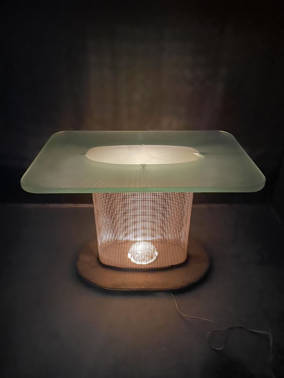 Une table d'appoint lumineuse très inhabituelle, réalisée en studio, à la manière de Mategot ou peut-être par lui. La maille métallique du diffuseur et de la base est du même type que celle utilisée sur plusieurs pièces de Mategot.