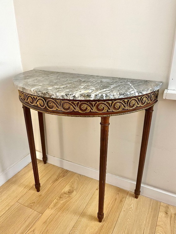 Cette console vintage, ornée d'incrustations de marbre arrondi, d'acajou et de bronze, apportera une touche d'élégance à votre intérieur. Elle peut être fixée au mur.