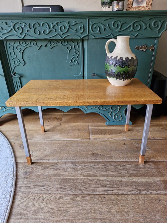 Très belle table au design rare sur pieds en aluminium avec pieds en bois à la base. La table a été laissée d'origine, les pieds pourraient être repeints. Très beau design, designer inconnu.